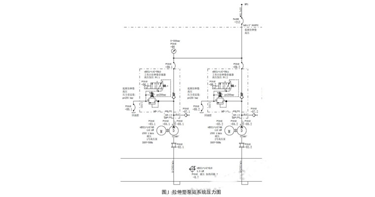拉伸墊泵站由控制油泵、高壓油泵、低壓油泵、循環(huán)冷卻泵組成。實際工作中,除開其它原因導致的泵啟動條件不滿足的情況外,系統(tǒng)壓力故障主要有兩種情況,液壓泵損壞和泵出口控制閥損壞。液壓泵或電機損壞直接導致系統(tǒng)無壓力,這種故障查找也非常簡單:啟動液壓泵檢查電機和泵的運行狀態(tài),如果運行正常,泵體和進出油管溫度與油箱溫度接近,說明泵沒有問題;如泵不能啟動,即可排查電機控制電路的熔斷器,如熔斷器正常,即可檢查電機繞組;若出現(xiàn)液壓泵能夠啟動但超負載的現(xiàn)象,需要拆分電機和泵的連接,分別盤車,排查故障是電機還是泵的原因造成。液壓拉伸墊泵站采用先導式溢流閥、換向閥和單向閥的組合,實現(xiàn)系統(tǒng)供油和泵無壓循環(huán)功能,如圖 1 所示:拉伸墊動作時系統(tǒng)壓力開關監(jiān)控到壓力降低至最小工作壓力,就會給出指令到控制溢流閥的換向閥;換向閥得電斷開先導閥回油,溢流閥停止無壓循環(huán)開始往系統(tǒng)供油;當系統(tǒng)壓力達到最大工作壓力后換向閥失電,系統(tǒng)開啟無壓循環(huán),單向閥阻止系統(tǒng)油液回流。由于從供油至無壓循環(huán)交替的過程中,單向閥也會隨開啟關閉動作,插裝式單向閥關閉時如果進出口壓差過大,閥芯關閉就會沖擊閥體,可能導致閥體碎裂,泵出口油路與回油管直通。若拉伸墊設備在投入使用初期,可能會多次出現(xiàn)單向閥損壞使得系統(tǒng)壓力不能建立故障,這就需要調低先導式溢流閥的開啟壓力即可解決這個問題。而溢流閥的壓力調整可以根據壓力切換時的狀態(tài)來調整,可先將壓力調高至單向閥關閉時到出現(xiàn)嚴重撞擊閥體上限,再略微調低壓力,直到單向閥柔和關閉為止。溢流閥壓力調整太低則會導致系統(tǒng)達不到最高壓力而一直供油,油液一直溢流回油箱的現(xiàn)象。