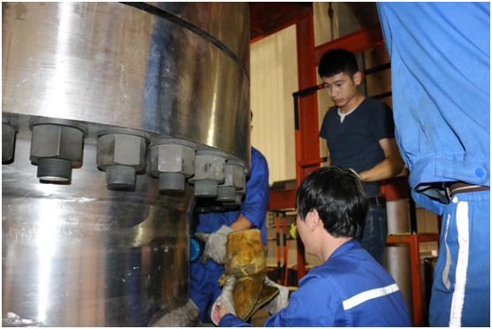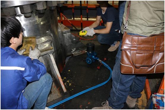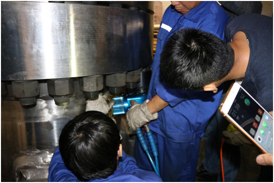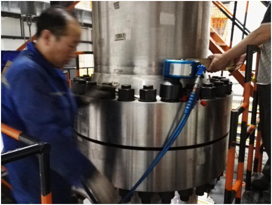 現(xiàn)場工作人員非常認(rèn)真地與波霆機械工程師進行交流、探討以及學(xué)習(xí)液壓扳手的正確操作方法。培訓(xùn)剛剛結(jié)束大家就開始忙碌起來,對應(yīng)兩個法蘭現(xiàn)場工人分成兩組,每組三個人,采用兩同步拆卸螺栓。