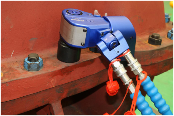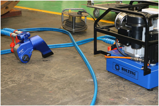 2、所有高精度設(shè)備,在螺栓終緊過(guò)程中,都應(yīng)該是對(duì)角或者四角施加扭矩,避免受力不均勻造成的法蘭變形或者密封受損,避免泄露,如采用電動(dòng)扭矩扳手或者氣動(dòng)扭矩扳手,需要兩個(gè)操作工程師用兩把電動(dòng)扭矩扳手對(duì)螺栓進(jìn)行擰緊工作,時(shí)機(jī)配合等都需要相當(dāng)默契,那么四同步的情況下呢?成本相對(duì)于液壓扳手來(lái)說(shuō)更高,采用液壓扳手則避免了這個(gè)問(wèn)題,配置的電動(dòng)液壓泵為四同步,同一臺(tái)動(dòng)力源,不可能一臺(tái)扳手是50Mpa,另一臺(tái)48Mpa,后期有需要增加到四同步,僅需再配兩把液壓扳手和套筒即可,無(wú)需再購(gòu)買液壓泵站。