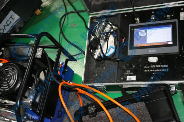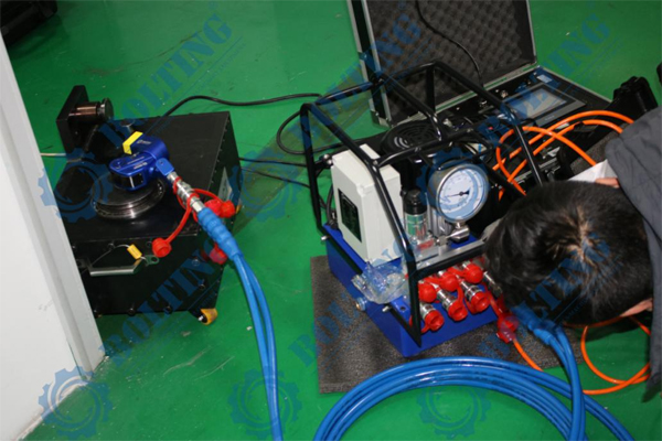 液壓扭力扳手第三方扭矩校驗檢測,理論上液壓扭力扳手檢測標定與液壓泵的型號和流量無關,液壓扭力扳手泵經過校正壓力表,均可對液壓扭力扳手進行檢測,經過長期及大量的實踐證明,液壓泵的流量與扭矩大小息息相關,舉例說明,BOLTING博霆PE55液壓扭力扳手泵和BOLTING博霆PE110液壓扭力扳手泵,采用同一塊經過校驗壓力表,分先后順序緊固一顆螺栓,由PE55液壓扭力扳手泵配套液壓扭力扳手先進行緊固,達到設定壓力后(300bar),擰不動了,換PE110液壓扭力扳手泵,壓力同樣設定300bar,壓力相同,螺栓同樣可以轉動,反之,采用PE55液壓扭力扳手泵,配合此扳手,壓力設定到300bar,確無法松動螺栓,配PE110液壓扭力扳手泵可輕松拆卸此螺栓,得出結論,液壓扭力扳手在工作過程中,需克服摩擦力,雖然液壓扭力扳手無沖擊性,但流量決定可以克服多少摩擦力,液壓扭力扳手怎樣檢測更精準?市場上部分廠家流量與扭矩存在虛標成分(電動液壓泵流量檢測最簡單方式,可采用單向閥裝置連接液壓油管,將液壓泵調整至所需檢測的壓力流量,每分鐘溢出的油量則是液壓泵流量,測流量裝置BOLTING博霆有售),計量院或第三方檢測機構所采用的液壓泵型號不盡相同,采用購買液壓扭力扳手配套的電動液壓扭力扳手泵,配套進行檢測更為精確。
