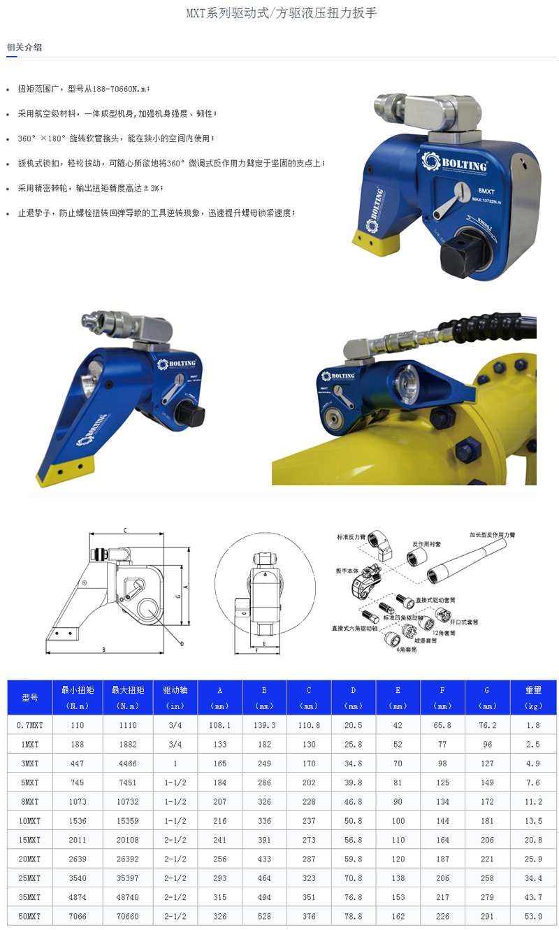BOLTING品牌提供優(yōu)質(zhì)的工業(yè)工具組合:液壓扳手、螺栓拉伸器、液壓泵站、力矩倍增器、電動(dòng)扭矩扳手、氣動(dòng)扭矩扳手、液壓拉馬、液壓壓床、法蘭分離器、螺母破切器等多種類(lèi)的產(chǎn)品,滿(mǎn)足各種客戶(hù)應(yīng)用要求。